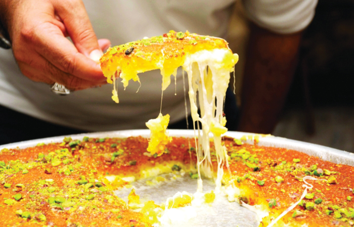 The iconic dessert of Nablus, made with sweet cheese, shredded phyllo dough, soaked in syrup and topped with pistachios.
