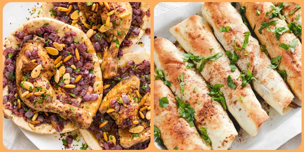 A quintessential dish of Taboon bread topped with sumac-spiced chicken, onions, and pine nuts, drenched in olive oil.